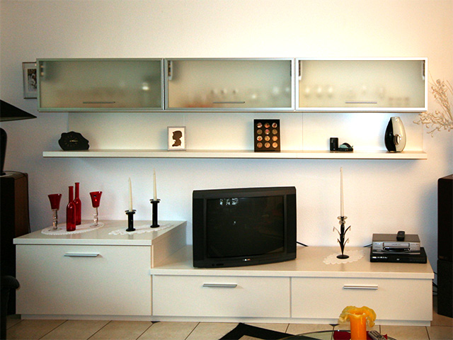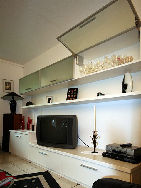 Wohnzimmerelement mit geradliniger Führung. Klapptüren mit Alu-Rahmen und satiniertem Glas. Schubkästen mit Vollauszug und „Soft-Einzug“.