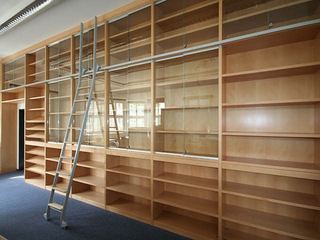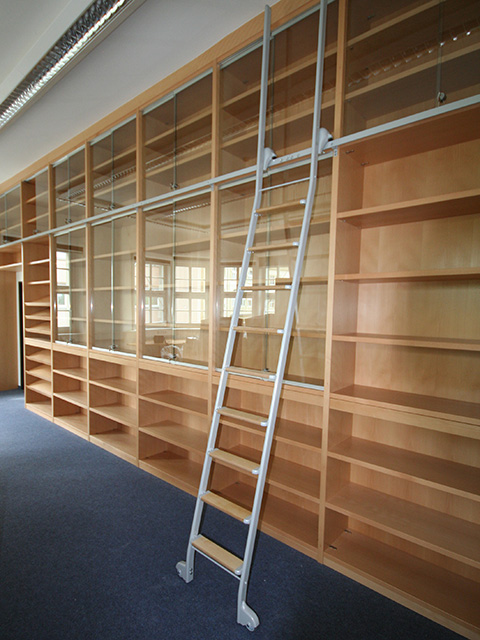 Einbaubibliothek in Buche furniert mit abschließbaren Glasschiebetüren und integrierter Schiebeleiter. Materialien: Buche furniert, Glas, Edelstahl | Uniklinik Würzburg | Februar 2007