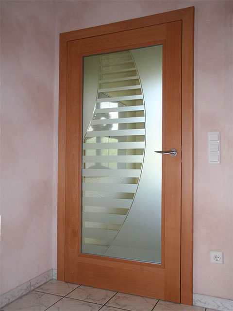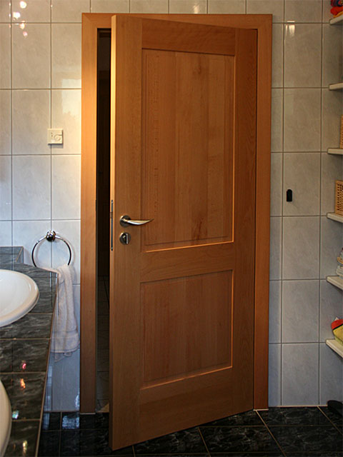 Nach Maß angefertigte, stumpfeinschlagende Türen in Buche vollmassiv (mehrschichtverleimt) mit Füllungen und Tectus-Bändern. Glasdesign vom Kunden selbst entworfen.