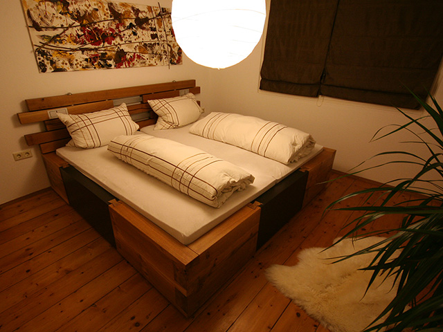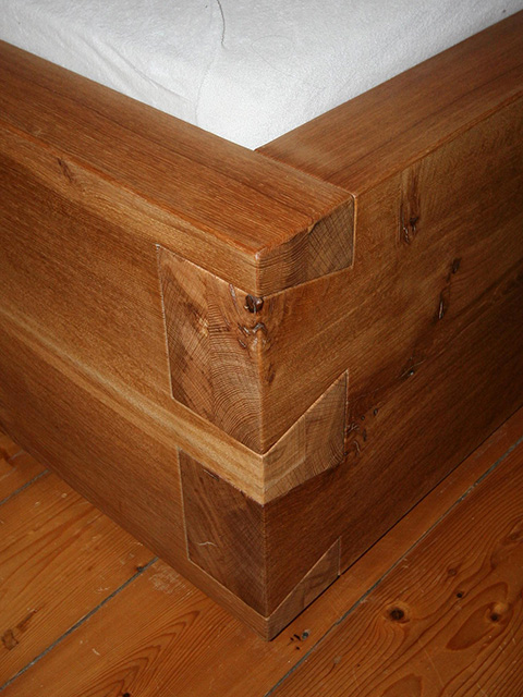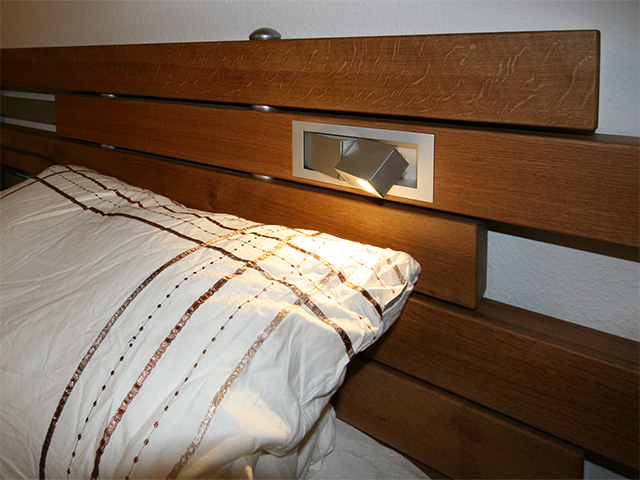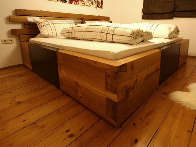 Massivholz natur lackiert, kombiniert mit dunkel braun lackierten Elementen. Gearbeitet mit klassischen Holzverbindungen, das Kopfteil wurde mit Eichekanthölzern gestaltet, die Leuchten wurden links und rechts eingelassen.