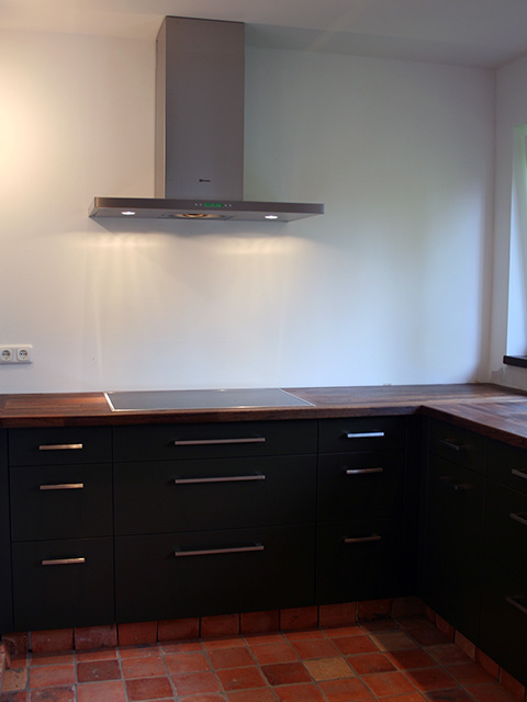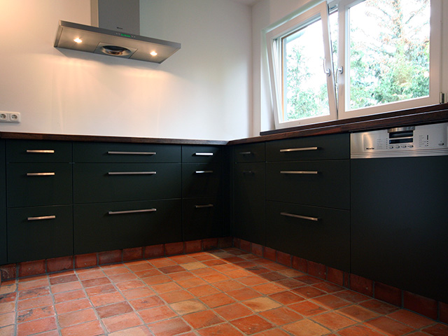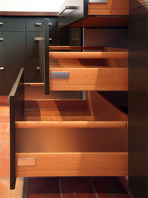 Einbauküche in U-Form mit Buche-Schubkastenvollauszügen und Edelstahlgriffen, Ecklösung mit Eckschrankdrehauszug, Schubkastenseitenteile mit satiniertem Glas, Fliesensockel.
