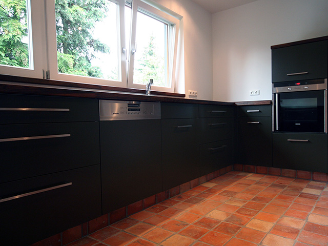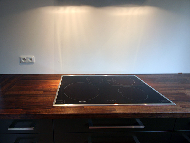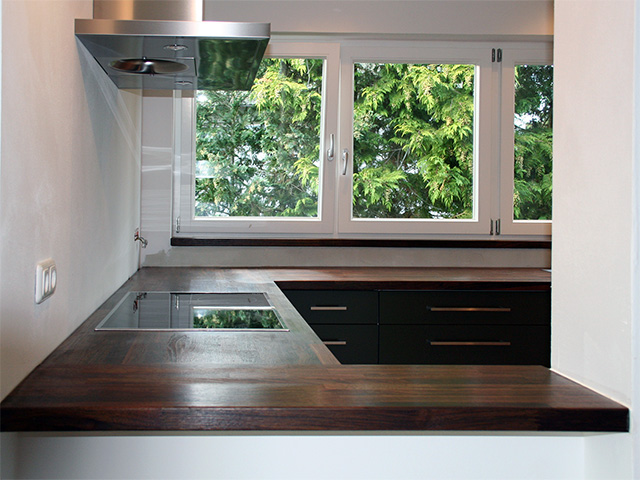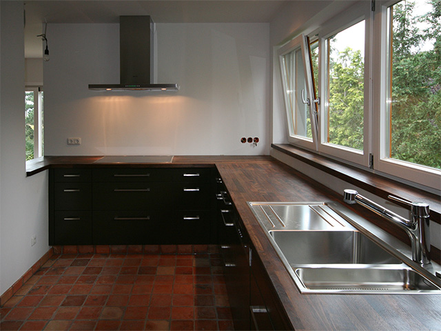 Materialien: Arbeitsplatte aus asiatischem Nussbaum, Fronten Ocker Oliv lackiert, Korpusse kunststoffbeschichtet weiß | Privat Wiesbaden | September 2009