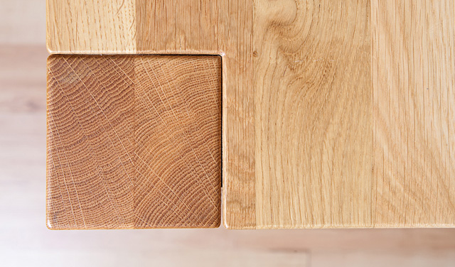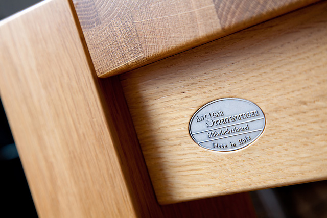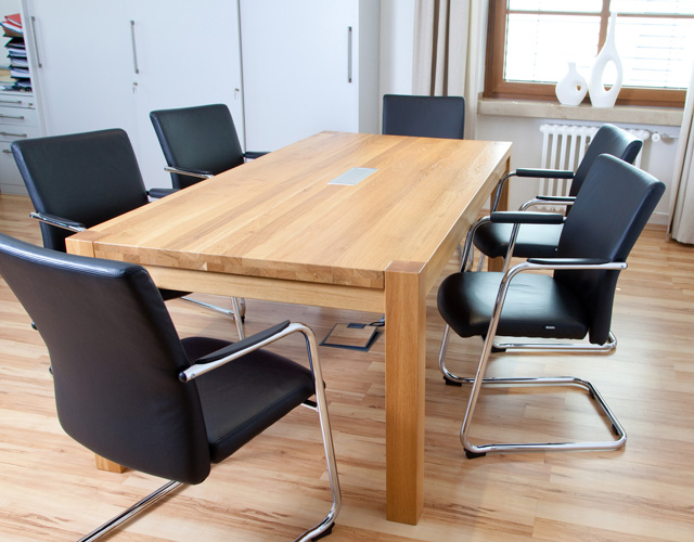 Besprechungstisch in Eiche massiv mit drehbarer Einbausteckdose „Turn“. Auf Knopfdruck offenbart dabei die „Turn“ ihre inneren Werte: Steckdosen, Netzwerkverbindungen, USB-Anschlußmöglichkeiten stehen bequem und schnell zur Verfügung.