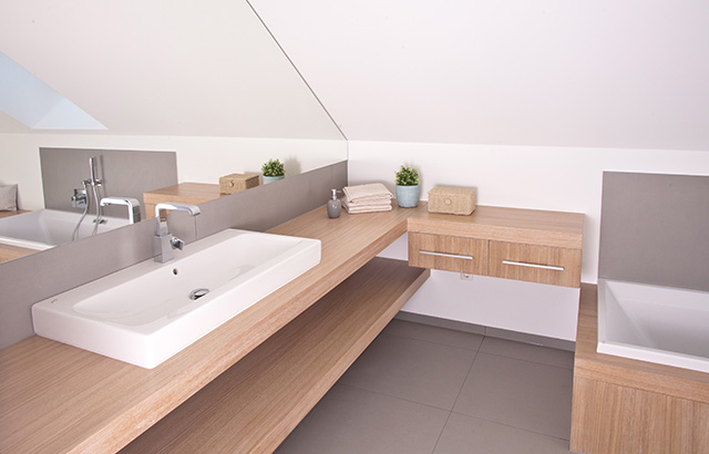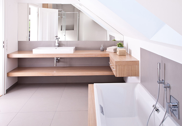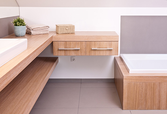 Waschtischablage ohne sichtbare Befestigung, rechts mit zwei Schubkastenvollauszügen, raumhohe Verkleidung des WC-Spülkastens mit integrierter, beleuchteter Nische, Badewannenverkleidung.